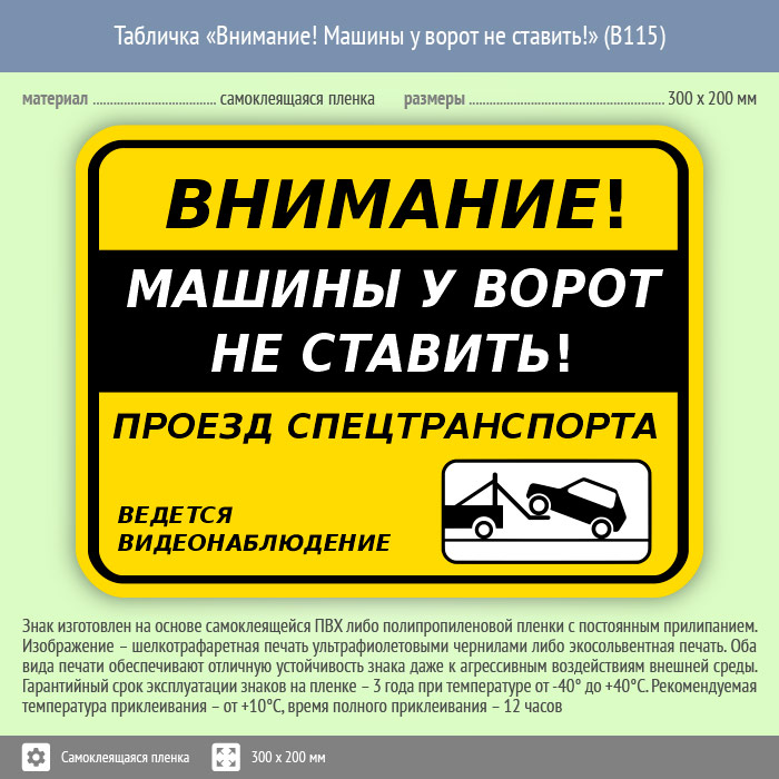 Знак (табличка) «Внимание! Машины у ворот не ставить!» имеет размер(ы): 300х200 мм, 400х300 мм, 600х400 мм, но может быть изготовлен(а) любого размера на самоклеящейся пленке, пластике толщиной 0.5, 2 или 4 мм и металле. Также возможно применение фотолюминесцентных и световозвращающих материалов