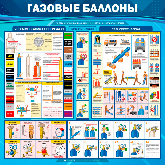 Стенд «Газовые баллоны» – это иллюстрированная информация об эксплуатации газовых баллонов, их окраска, надписи, маркировка, безопасность при транспортировке, погрузке и выгрузке, их хранении…