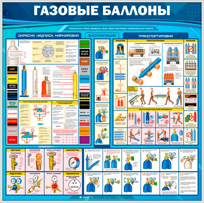 Стенд «Газовые баллоны» – это иллюстрированная информация об эксплуатации газовых баллонов, их окраска, надписи, маркировка, безопасность при транспортировке, погрузке и выгрузке, их хранении…