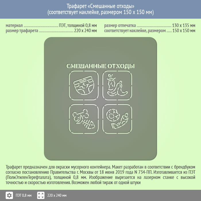 Трафарет «Смешанные отходы» предназначен для окраски мусорного контейнера. Макет разработан в соответствии с брендбуком согласно постановления Правительства г. Москвы от 18 июня 2019 года N 734-ПП. Трафарет имеет 5 типоразмеров, каждый из которых соответствует аналогу на самоклеящейся пленке