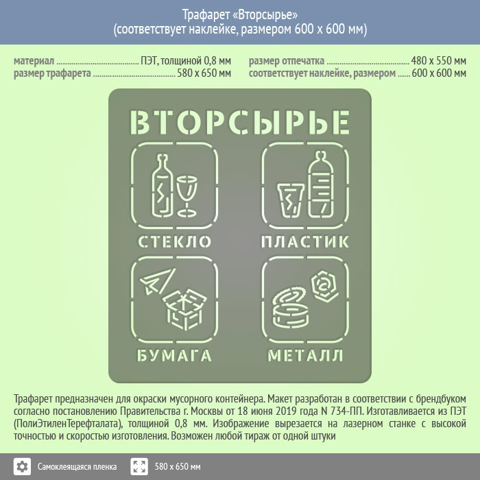 Трафарет «Вторсырьё», размером 580х650 мм предназначен для окраски мусорного контейнера. Макет разработан в соответствии с брендбуком согласно постановления Правительства г. Москвы от 18 июня 2019 года N 734-ПП. Размер отпечатка - 480х550 мм, что соответствует аналогу на самоклеящейся пленке, размером 600х600 мм