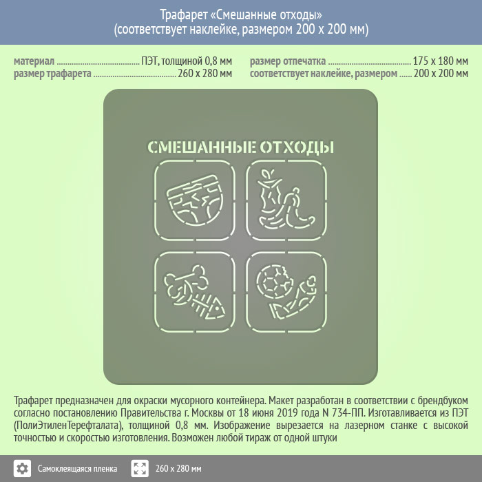 Трафарет «Смешанные отходы», размером 260х280 мм предназначен для окраски мусорного контейнера. Макет разработан в соответствии с брендбуком согласно постановления Правительства г. Москвы от 18 июня 2019 года N 734-ПП. Размер отпечатка - 175х180 мм, что соответствует аналогу на самоклеящейся пленке, размером 200х200 мм