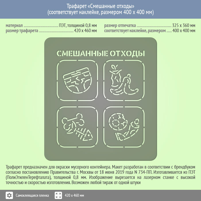 Трафарет «Смешанные отходы», размером 420х460 мм предназначен для окраски мусорного контейнера. Макет разработан в соответствии с брендбуком согласно постановления Правительства г. Москвы от 18 июня 2019 года N 734-ПП. Размер отпечатка - 325х360 мм, что соответствует аналогу на самоклеящейся пленке, размером 400х400 мм