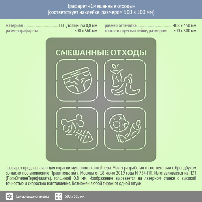 Трафарет «Смешанные отходы», размером 500х560 мм предназначен для окраски мусорного контейнера. Макет разработан в соответствии с брендбуком согласно постановления Правительства г. Москвы от 18 июня 2019 года N 734-ПП. Размер отпечатка - 408х450 мм, что соответствует аналогу на самоклеящейся пленке, размером 500х500 мм