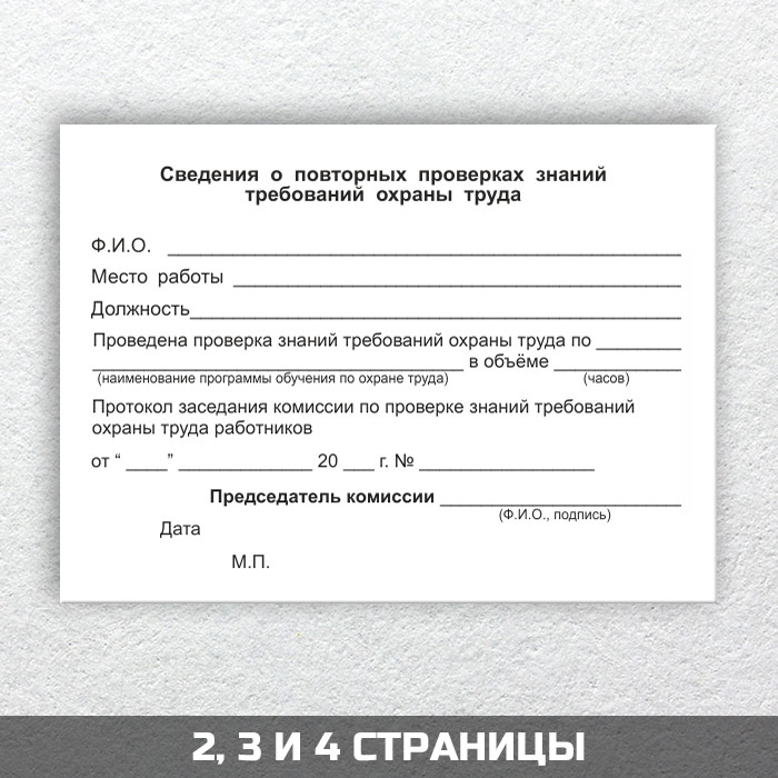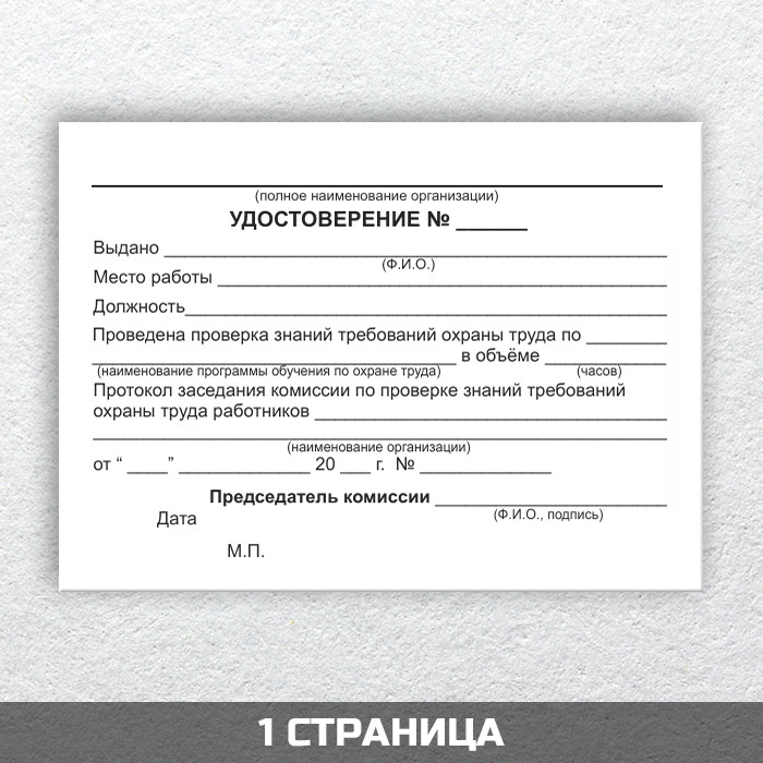 Бланк удостоверения о проверке знаний требований охраны труда соответствует Приложению 2 к Постановлению Минтруда России и Минобразования России от 13 января 2003 г. № 1/29. Работнику, успешно прошедшему обучение и проверку знаний требований охраны труда, выдается Удостоверение о проверке знаний требований охраны труда за подписью председателя комиссии по проверке знаний требований охраны труда, заверенное печатью организации, проводившей обучение по охране труда и проверку знаний требований охраны труда по форме согласно приложению № 2 к Порядку обучения по охране труда и проверки знаний требований охраны труда работников организаций, утвержденному постановлением Минтруда России и Минобразования России от 13 января 2003 г. № 1/29