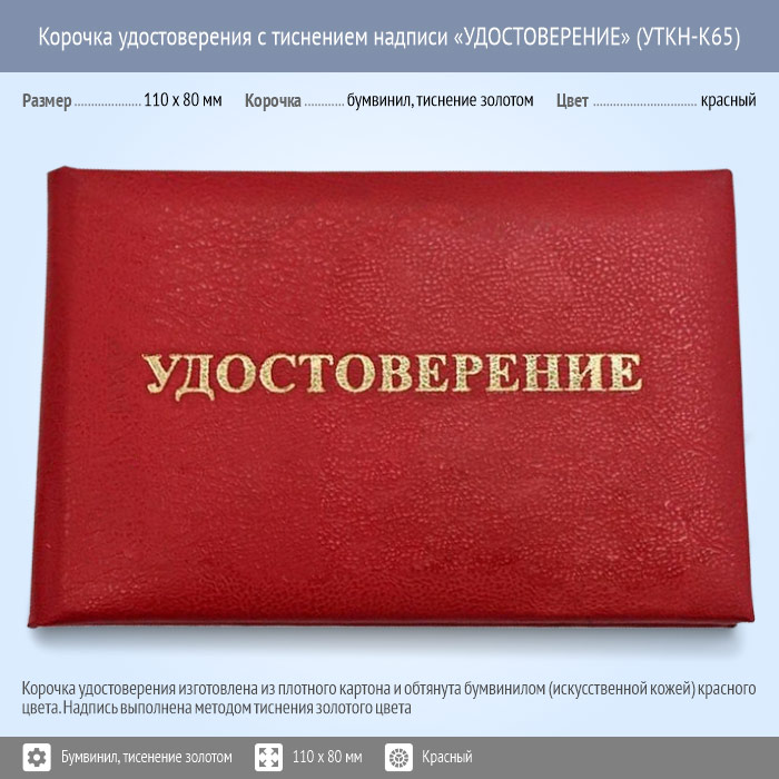 Бланк удостоверения, размером 110 х 80 мм изготовлена из плотного картона, обтянутого искусственной кожей (бумвинилом) красного цвета. Это очень выносливый и долговечный многослойный переплетный материал, который не боится влаги, не трется и не рвется, не трескается от многократных сгибаний и разгибаний удостоверения. Надпись «УДОСТОВЕРЕНИЕ» выполнена методом тиснения золотого цвета