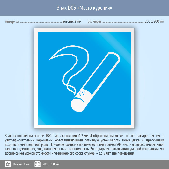 Знак D03 «Место курения» на пластике, размером 200х200 мм указывает, что данное место оборудовано для курильщиков. Указательные знаки безопасности изготовлены согласно ГОСТ Р 12.4.026-2015 и служат для обозначения разрешенных действий и местонахождения различных объектов