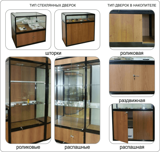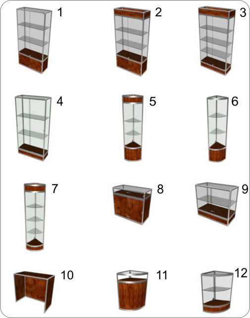 - Структура (форма) витрины может содержать фриз, цоколь или накопительную часть. Нижняя часть витрины для хранения необходимых материалов, скрытых от посетителя, также витрины могут быть угловыми