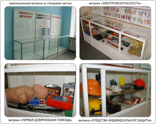 - Материал витрин – витрина для демонстрации средств защиты и необходимого инструмента, используемого при производстве работ, изготавливается из алюминиевого профиля (цвет профиля по желанию заказчика), вставок (цоколя, задней стенки и нижней полки) – из цветного ЛДСП, дверцы. Промежуточные полки и боковинки изготавливаются из стекла. Стендовая часть (при наличии) изготавливается из ПВХ-пластика