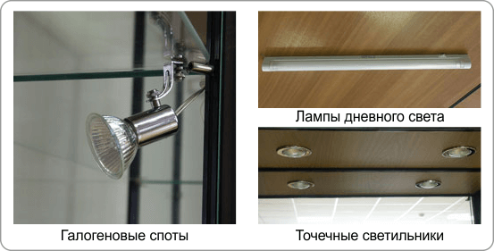 - Подсветка витрины. При необходимости (для пускания пыли в глаза) можно сделать подсветку витрины: внешнюю – при помощи спотов, внутреннюю – при помощи врезных или накладных лампочек