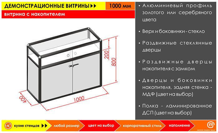 Предлагаем витрины с накопителем для демонстрации СИЗ различной ширины - 600, 1000 и 1200 мм. Высота всех витрин составляет 800 мм. Изготовливаются витрины из алюминиевого профиля золотого или серебряного цвета, верх и боковинки - стекло, раздвижные стеклянные дверцы, раздвижные дверцы накопителя с замком, дверцы и боковинки накопителя, задняя стенка - МДФ (цвет на выбор), полки из ламинированного ДСП (цвет на выбор)