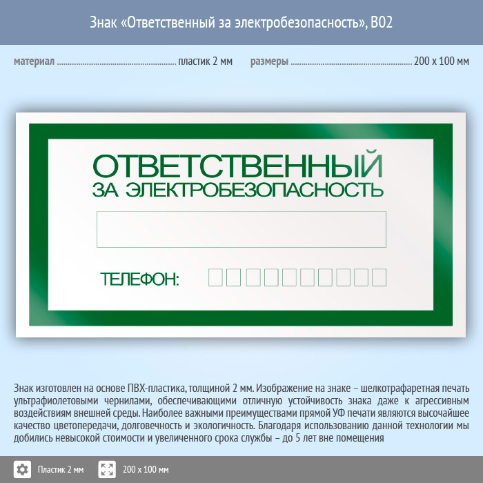 Знак «Ответственный за электробезопасность», B02 на пластике, размером 200х100 мм предназначена для информирования об ответственном за электробезопасность. Вспомогательные знаки и таблички полностью соответствуют современным требованиям и стандартам. Таблички с поясняющими надписями используются в качестве самостоятельного знака, либо в качестве дополнения к основному знаку безопасности