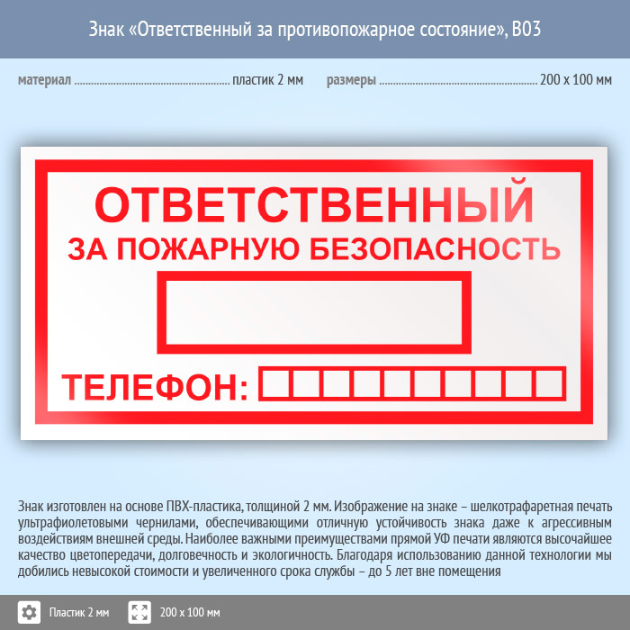 Знак «Ответственный за пожарную безопасность», B03 на пластике, размером 200х100 мм предназначена для информирования об ответственном за пожарную безопасность. Вспомогательные знаки и таблички полностью соответствуют современным требованиям и стандартам. Таблички с поясняющими надписями используются в качестве самостоятельного знака, либо в качестве дополнения к основному знаку безопасности