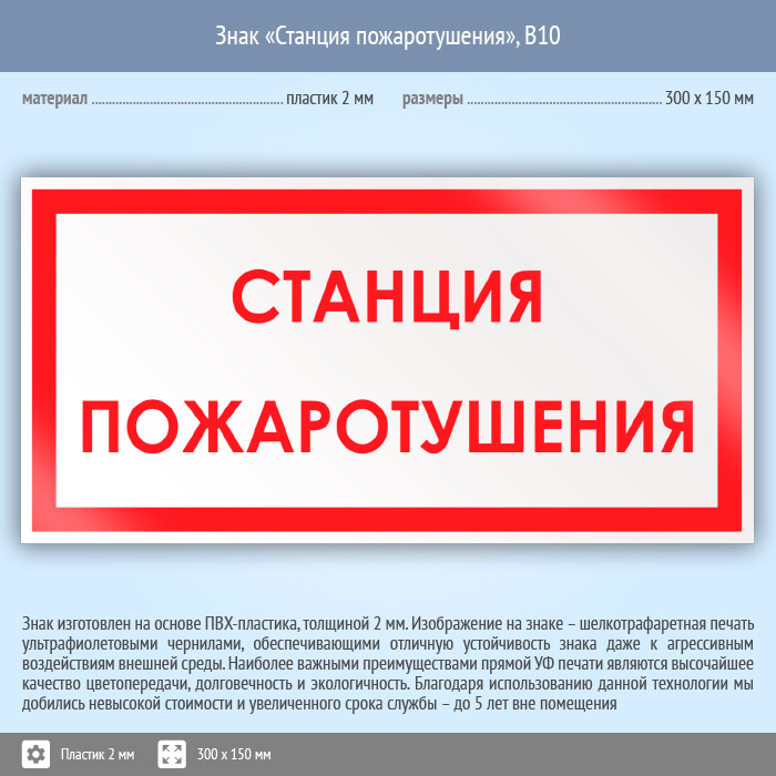 Знак «Станция пожаротушения», B10 на пластике, размером 300х150 мм служит для обозначения расположения станции пожаротушения. Вспомогательные знаки и таблички полностью соответствуют современным требованиям и стандартам. Таблички с поясняющими надписями используются в качестве самостоятельного знака, либо в качестве дополнения к основному знаку безопасности