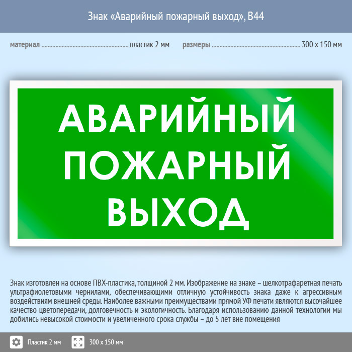 Знак «Аварийный пожарный выход», B44 на пластике, размером 300х150 мм обозначает место выхода в случае аварии или пожара. Вспомогательные знаки и таблички полностью соответствуют современным требованиям и стандартам. Таблички с поясняющими надписями используются в качестве самостоятельного знака, либо в качестве дополнения к основному знаку безопасности