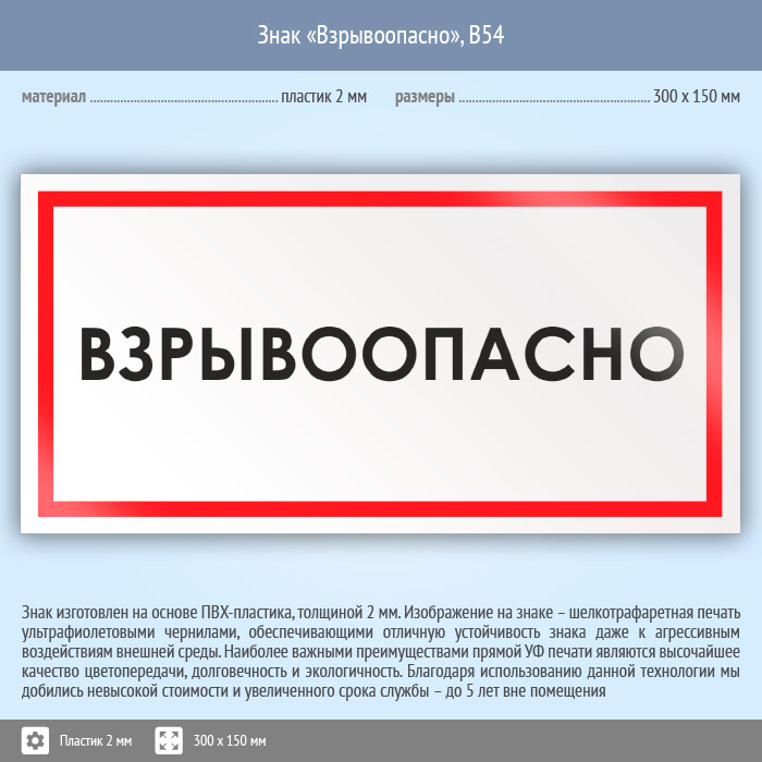 Знак «Взрывоопасно», B54 на пластике, размером 300х150 мм подскажет о том, что здесь огонь лучше не использовать, так как может произойти взрыв. Вспомогательные знаки и таблички полностью соответствуют современным требованиям и стандартам. Таблички с поясняющими надписями используются в качестве самостоятельного знака, либо в качестве дополнения к основному знаку безопасности