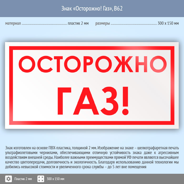 Знак «Осторожно! Газ», B62 на пластике, размером 300х150 мм призывает к осторожности, предупреждая о близости газа. Вспомогательные знаки и таблички полностью соответствуют современным требованиям и стандартам. Таблички с поясняющими надписями используются в качестве самостоятельного знака, либо в качестве дополнения к основному знаку безопасности