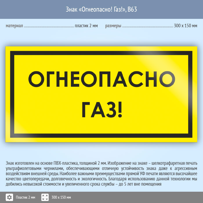 Знак «Огнеопасно! Газ!», B63 на пластике, размером 300х150 мм размещается в местах, где использование огня крайне нежелательно, в связи с близостью прохождения газа. Вспомогательные знаки и таблички полностью соответствуют современным требованиям и стандартам. Таблички с поясняющими надписями используются в качестве самостоятельного знака, либо в качестве дополнения к основному знаку безопасности