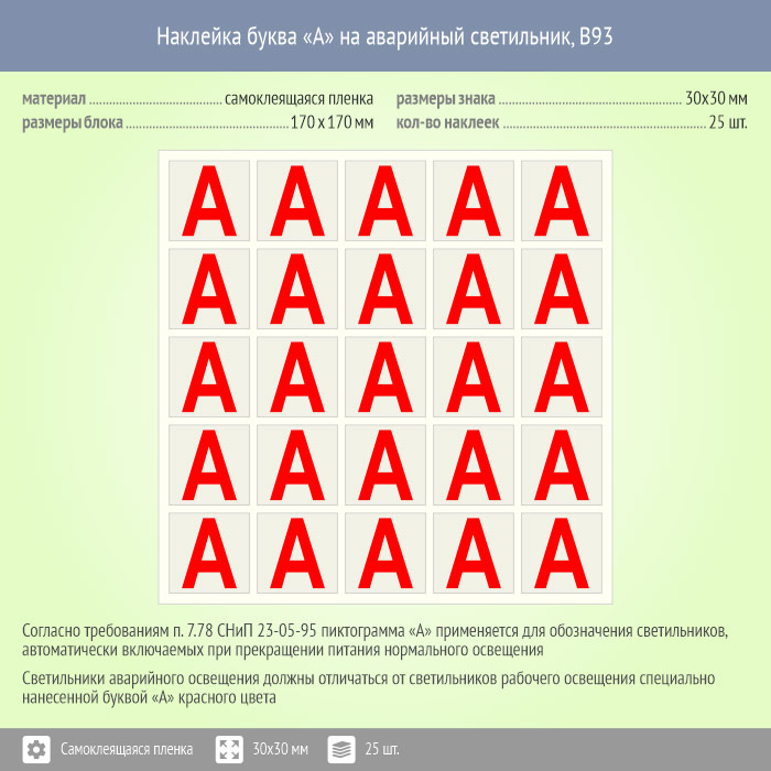 Наклейка буква «А» на аварийный светильник, B93 (пленка, 30х30 мм, блок 25 штук, 170х170 мм)