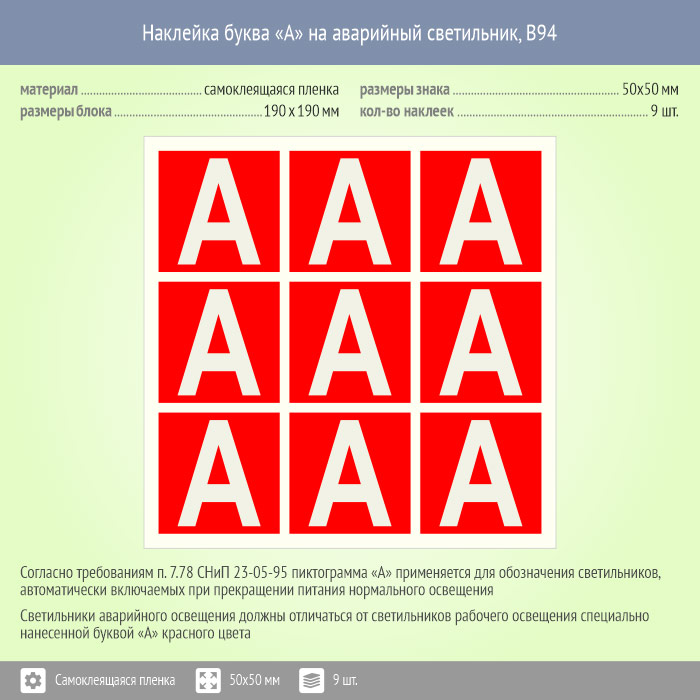 Самоклеящаяся буква «А» на аварийный светильник, B94 размером 50х50 мм поставляется блоком из 9 наклеек. Изготавливается на прозрачной самоклеящейся пленке с печатью экосольвентными чернилами, после чего каждая пиктограмма вырезается по контуру. Вид и размеры знака пиктограммы на аварийный светильник полностью соответствуют требованиям нормативных документов