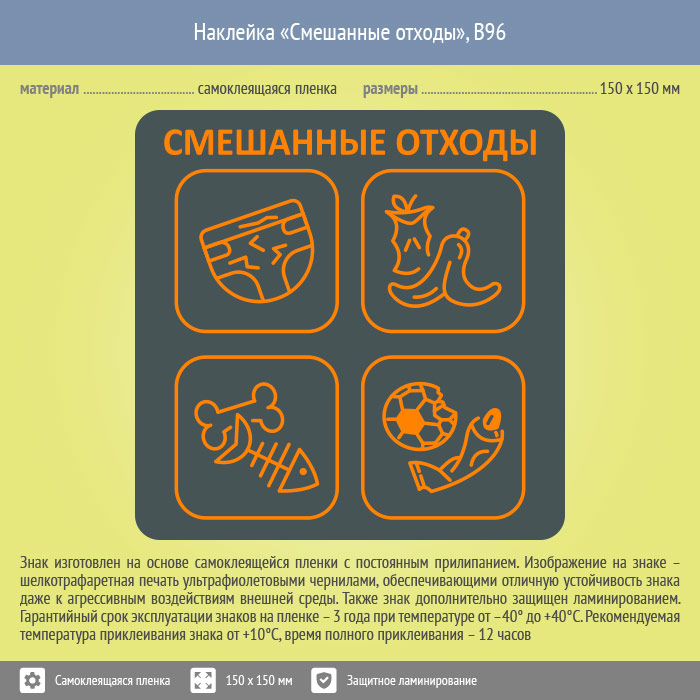 Наклейка на бак «Смешанные отходы», B96 напечатана на самоклеящейся пленке, размером 150х150 мм и выполнена в соответствии с брендбуком согласно постановлению Правительства г. Москвы от 18 июня 2019 года N 734-ПП. Поверхность изображения защищена ламинированием, что увеличивает срок службы наклейки