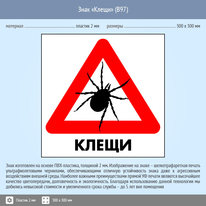 Знак «Клещи», B97 изготовлен на пластике, размером 200х200 мм