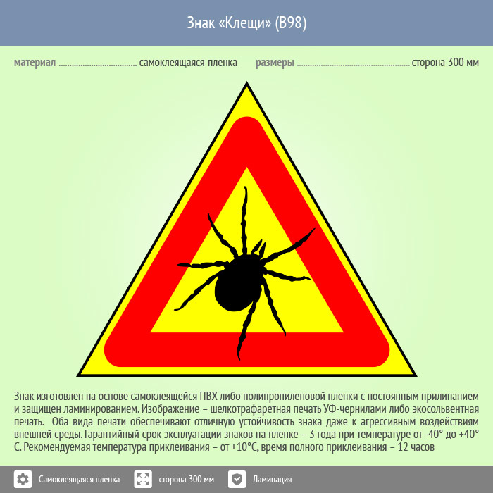 Знак «Клещи», B98 изготовлен на самоклеящейся пленке, размером: сторона 200 мм. Поверхность изображения защищена ламинированием, что увеличивает срок службы знака