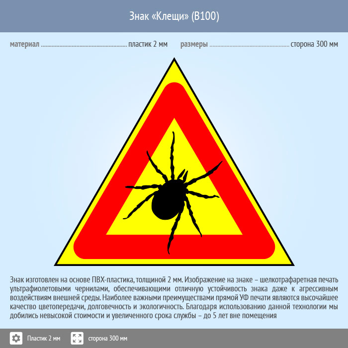 Знак «Опасно! Клещи», B100 изготовлен на пластике, размером: сторона 200 мм