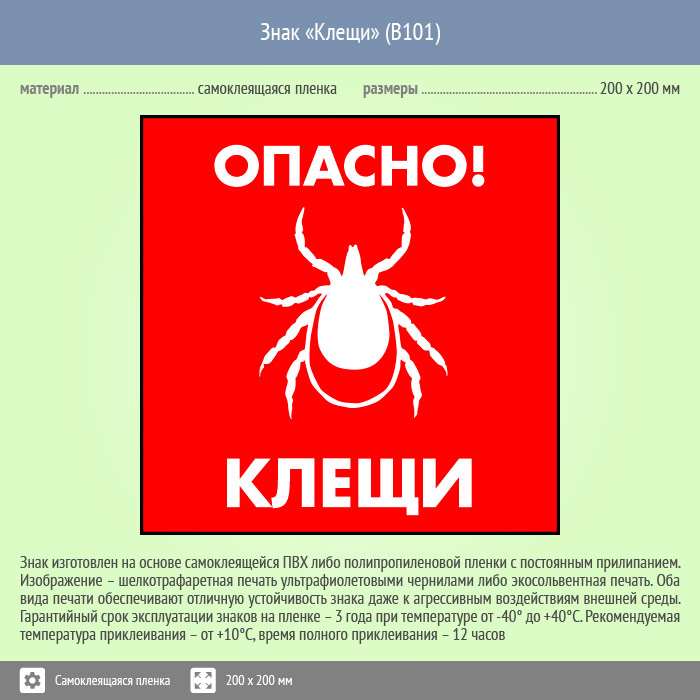 Знак «Опасно! Клещи», B101 изготовлен на самоклеящейся пленке, размером: 200х200 мм