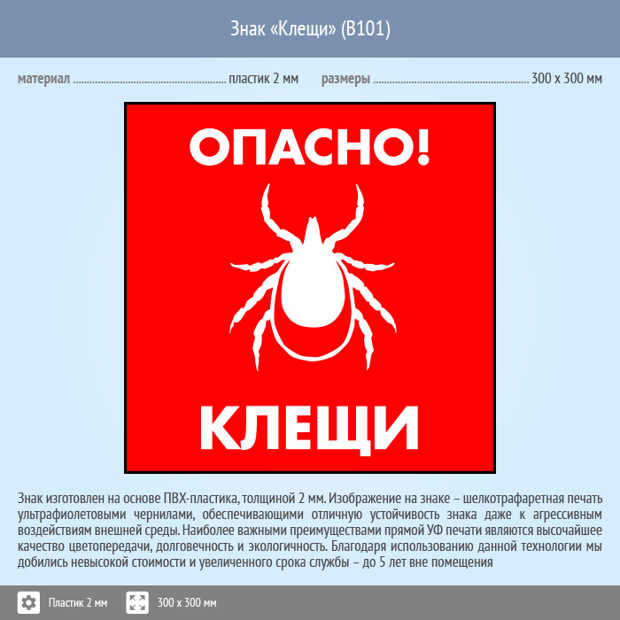 Знак «Опасно! Клещи», B101 изготовлен на пластике, размером: 300х300 мм