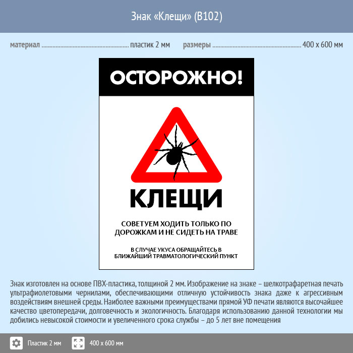 Знак «Осторожно! Клещи», B102 изготовлен на пластике, размером: 300х400 мм