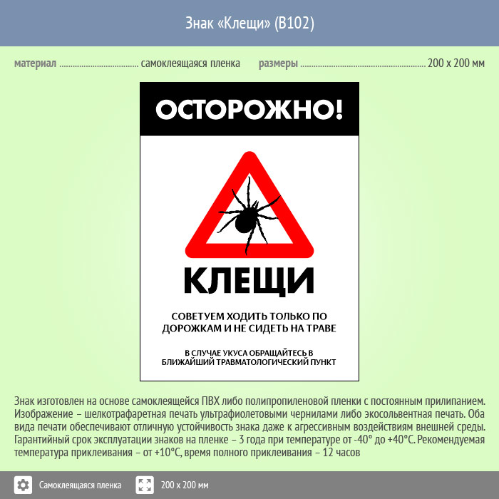 Знак «Осторожно! Клещи», B102 изготовлен на самоклеящейся пленке, размером: 400х600 мм
