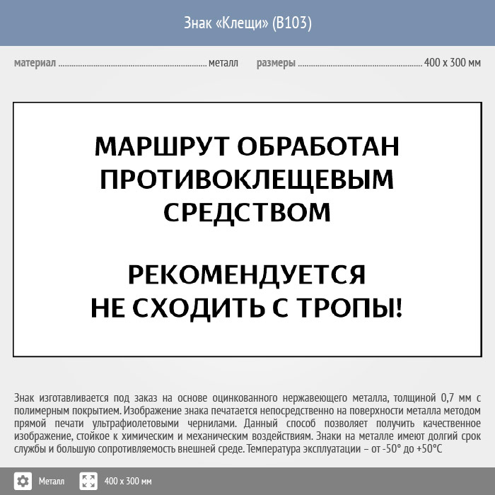 Знак изготавливается под заказ на основе оцинкованного нержавеющего металла, толщиной 0,7 мм с полимерным покрытием. Изображение знака печатается непосредственно на поверхности металла методом прямой печати ультрафиолетовыми чернилами. Данный способ позволяет получить качественное изображение, стойкое к химическим и механическим воздействиям. Знаки на металле имеют долгий срок службы и большую сопротивляемость внешней среде. Температура эксплуатации – от -50° до +50°С