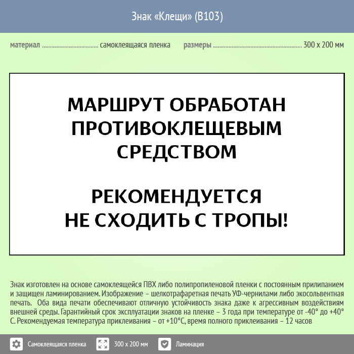 Знак «Клещи», B103 изготовлен на самоклеящейся пленке, размером: 400х300 мм. Поверхность изображения защищена ламинированием, что увеличивает срок службы знака