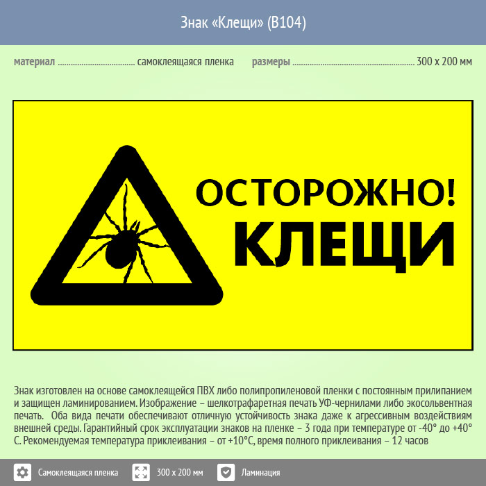 Знак «Осторожно! Клещи», B104 изготовлен на самоклеящейся пленке, размером: 400х300 мм. Поверхность изображения защищена ламинированием, что увеличивает срок службы знака