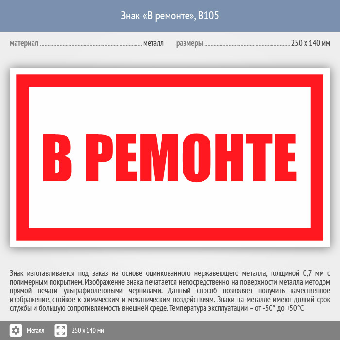 Знак «В ремонте», B105 на металле, размером 250х140 мм предупреждает о том, что оборудование находится в ремонте. Знаки и плакаты по электробезопасности изготовлены согласно требованиям Министерства энергетики России и являются предупреждающими знаками об опасности, связанной с электронапряжением