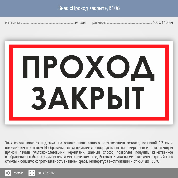 Знак «Проход закрыт», B106 на металле, размером 300х150 мм используется для предупреждения о запрете прохода. Вспомогательные знаки и таблички полностью соответствуют современным требованиям и стандартам. Таблички с поясняющими надписями используются в качестве самостоятельного знака, либо в качестве дополнения к основному знаку безопасности