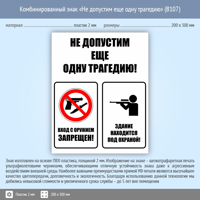 Комбинированный знак «Не допустим еще одну трагедию», B107 на пластике, размером200х300 мм. Вспомогательные знаки и таблички полностью соответствуют современным требованиям и стандартам. Таблички с поясняющими надписями используются в качестве самостоятельного знака, либо в качестве дополнения к основному знаку безопасности