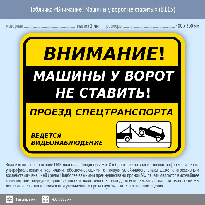Табличка «Внимание! Машины у ворот не ставить!», B115 (пластик, 400х300 мм)