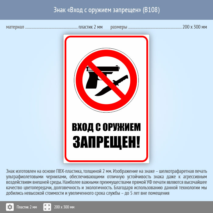 Знак «Вход с оружием запрещен», B108 на пластике, размером 200х300 мм. Вспомогательные знаки и таблички полностью соответствуют современным требованиям и стандартам. Таблички с поясняющими надписями используются в качестве самостоятельного знака, либо в качестве дополнения к основному знаку безопасности