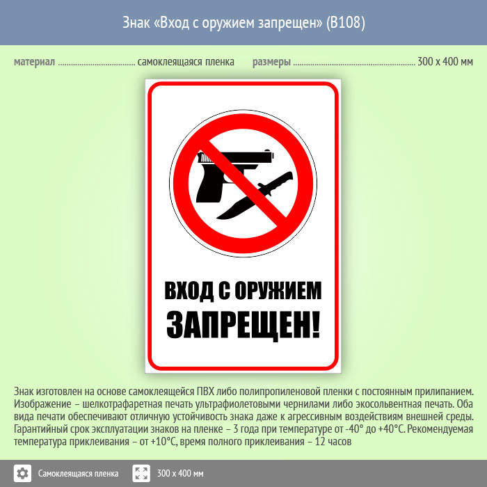 Знак «Вход с оружием запрещен», B108 на пленке, размером 300х400 мм. Вспомогательные знаки и таблички полностью соответствуют современным требованиям и стандартам. Таблички с поясняющими надписями используются в качестве самостоятельного знака, либо в качестве дополнения к основному знаку безопасности