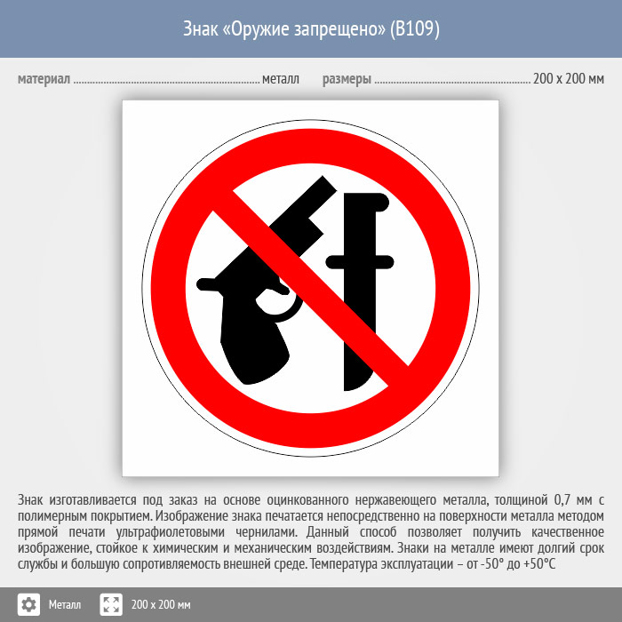Знак «Оружие запрещено», B109 на металле, размером 200х200 мм. Вспомогательные знаки и таблички полностью соответствуют современным требованиям и стандартам. Таблички с поясняющими надписями используются в качестве самостоятельного знака, либо в качестве дополнения к основному знаку безопасности