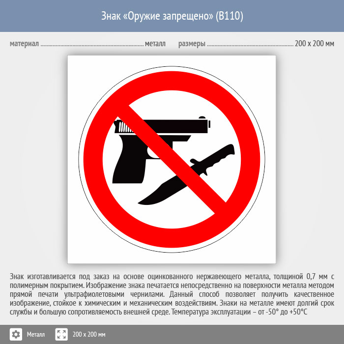 Знак «Оружие запрещено», B110 на металле, размером 200х200 мм. Вспомогательные знаки и таблички полностью соответствуют современным требованиям и стандартам. Таблички с поясняющими надписями используются в качестве самостоятельного знака, либо в качестве дополнения к основному знаку безопасности