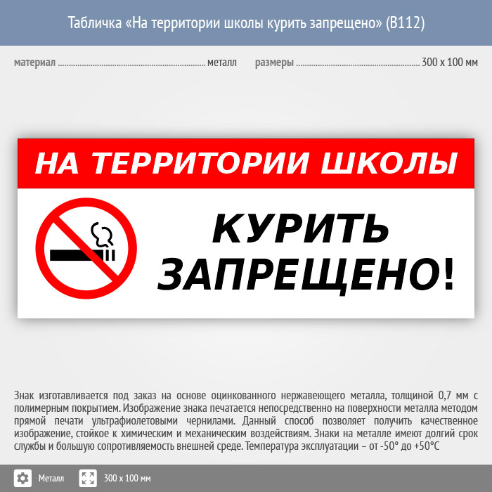 Табличка «На территории школы курить запрещено», B112 (металл, 300х100 мм)