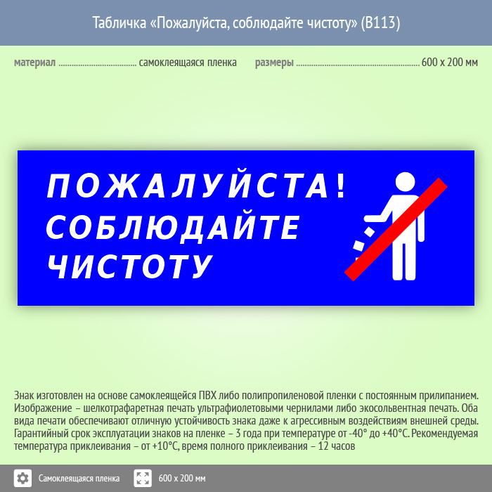 Табличка «Пожалуйста, соблюдайте чистоту», B113 на пленке, размером 600х200 мм. Вспомогательные знаки и таблички полностью соответствуют современным требованиям и стандартам. Таблички с поясняющими надписями используются в качестве самостоятельного знака, либо в качестве дополнения к основному знаку безопасности