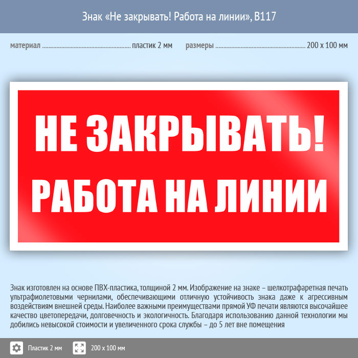 Знак «Не закрывать! Работа на линии», B117 (пластик, 200х100 мм)