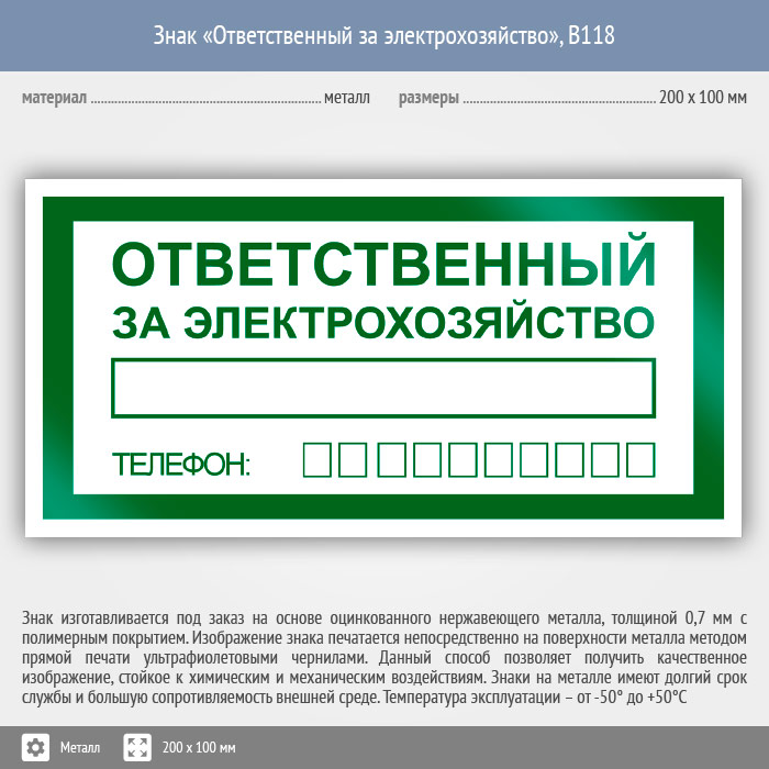 Знак «Ответственный за электрохозяйство», B118 (металл, 200х100 мм)