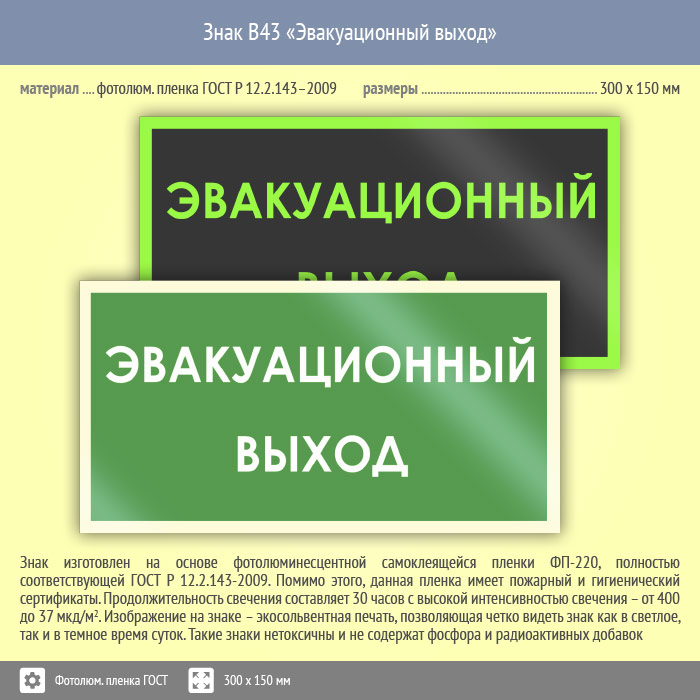 Знак B43 «Эвакуационный выход» на фотолюминесцентной пленке по ГОСТ 34428-2018, размером 300х150 мм служит для обозначения запасного или эвакуационного выхода, обычно редко используемого. Вспомогательные знаки и таблички полностью соответствуют современным требованиям и стандартам. Таблички с поясняющими надписями используются в качестве самостоятельного знака, либо в качестве дополнения к основному знаку безопасности