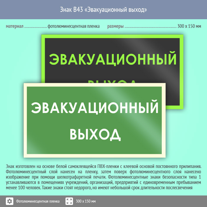 Знак B43 «Эвакуационный выход» на фотолюминесцентной пленке, размером 300х150 мм служит для обозначения запасного или эвакуационного выхода, обычно редко используемого. Вспомогательные знаки и таблички полностью соответствуют современным требованиям и стандартам. Таблички с поясняющими надписями используются в качестве самостоятельного знака, либо в качестве дополнения к основному знаку безопасности