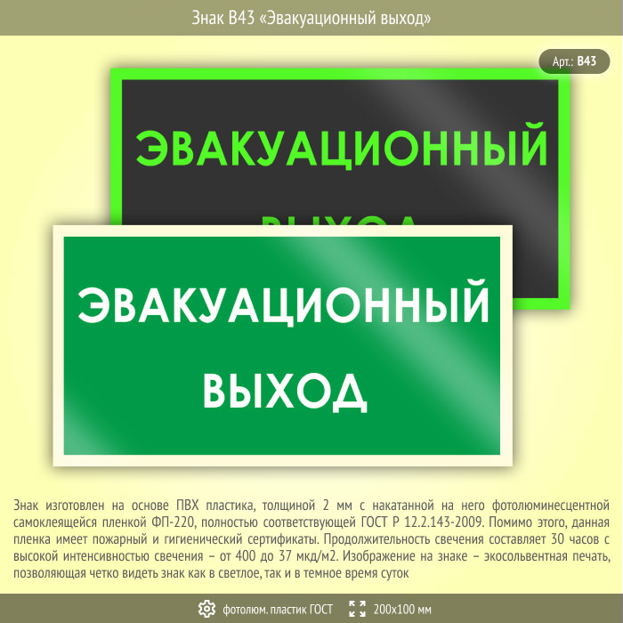 Знак B43 «Эвакуационный выход» на фотолюминесцентном пластике по ГОСТ 34428-2018, размером 200х100 мм служит для обозначения запасного или эвакуационного выхода, обычно редко используемого. Вспомогательные знаки и таблички полностью соответствуют современным требованиям и стандартам. Таблички с поясняющими надписями используются в качестве самостоятельного знака, либо в качестве дополнения к основному знаку безопасности